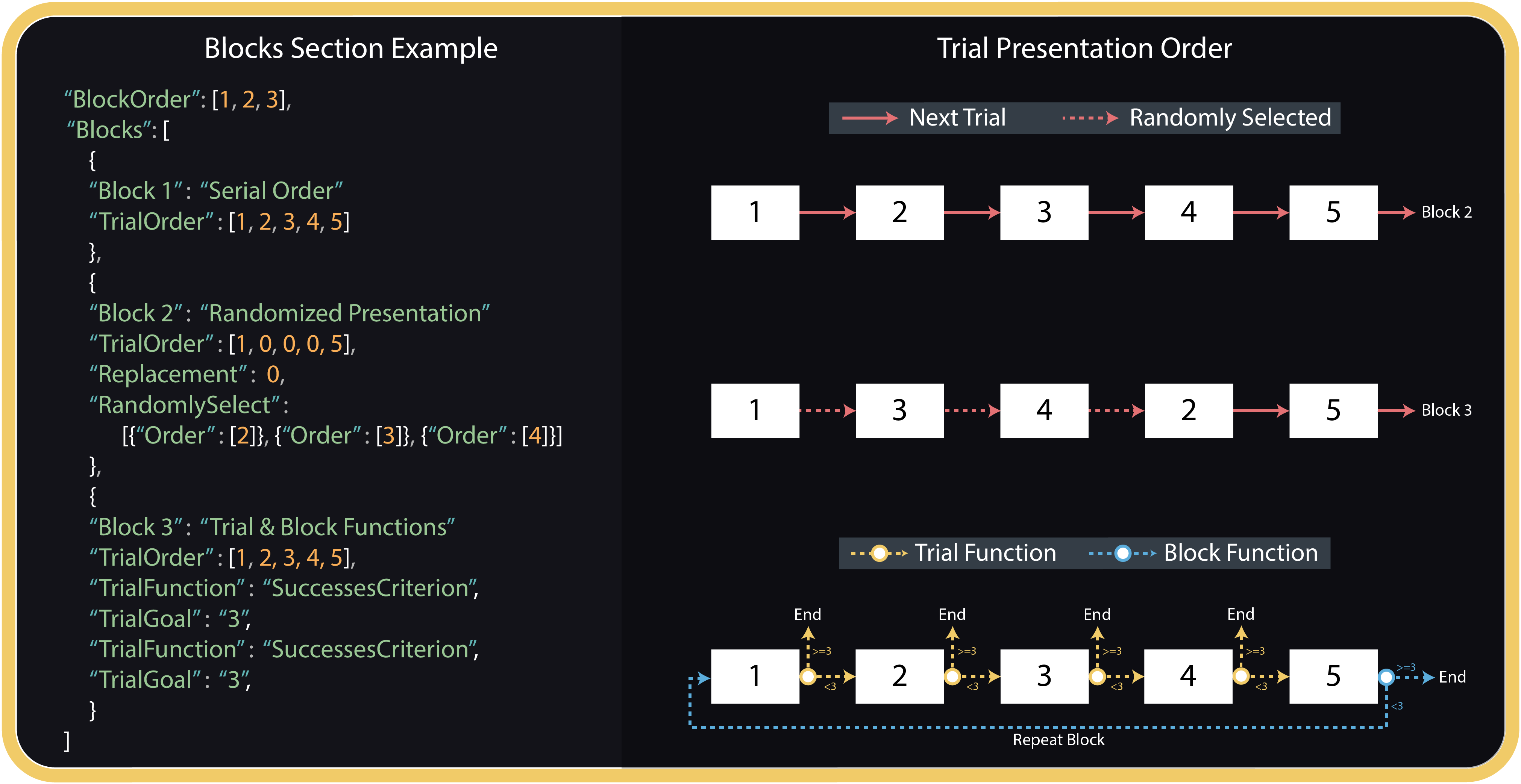| BlockOrder | [1,2,2,...] | Dictates the order in which Blocks will be presented when the experiment is launched. Each number in this list corresponds to the index of a Block. Blocks can be presented in any order and called multiple times within the BlockOrder list. |