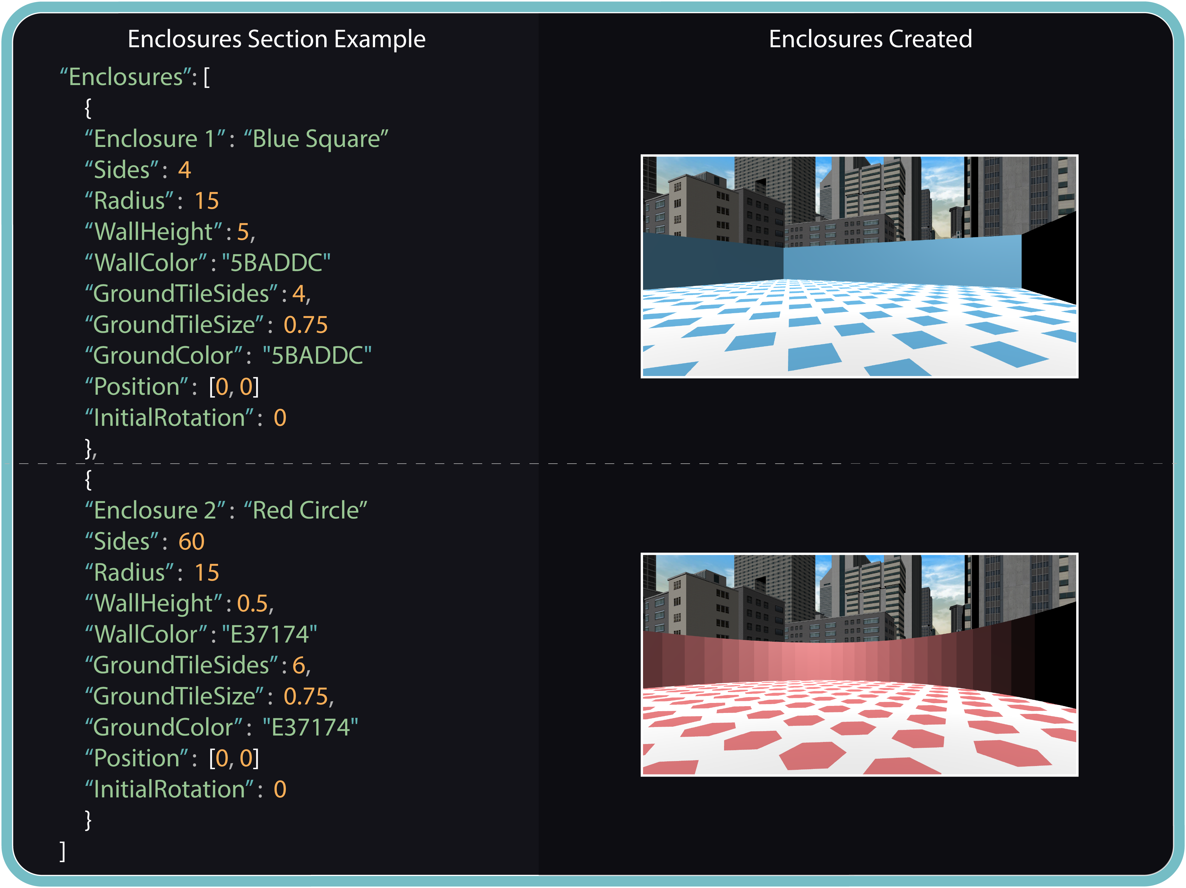 | WallColor | “00ff00” | A 6-digit HEX color code which defines the color of the Enclosure walls. Enclosures can be made invisible by using “ffffff00”. Click here to find HEX color codes. |