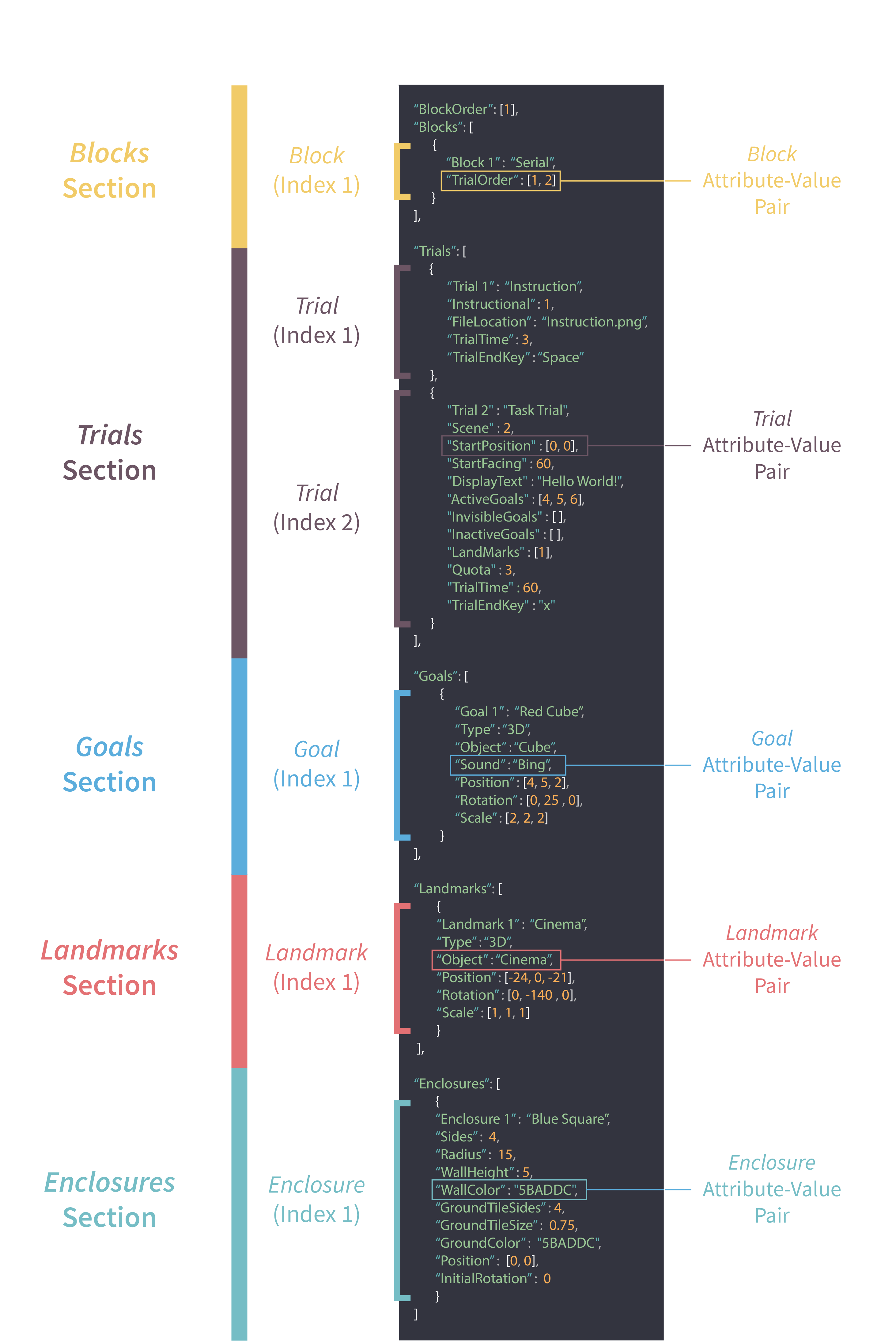 Each Configuration File includes a Settings section and five Experiment Object Sections: (1) Blocks; (2) Trials; (3) Goals; (4) Landmarks; and (5) Enclosures.