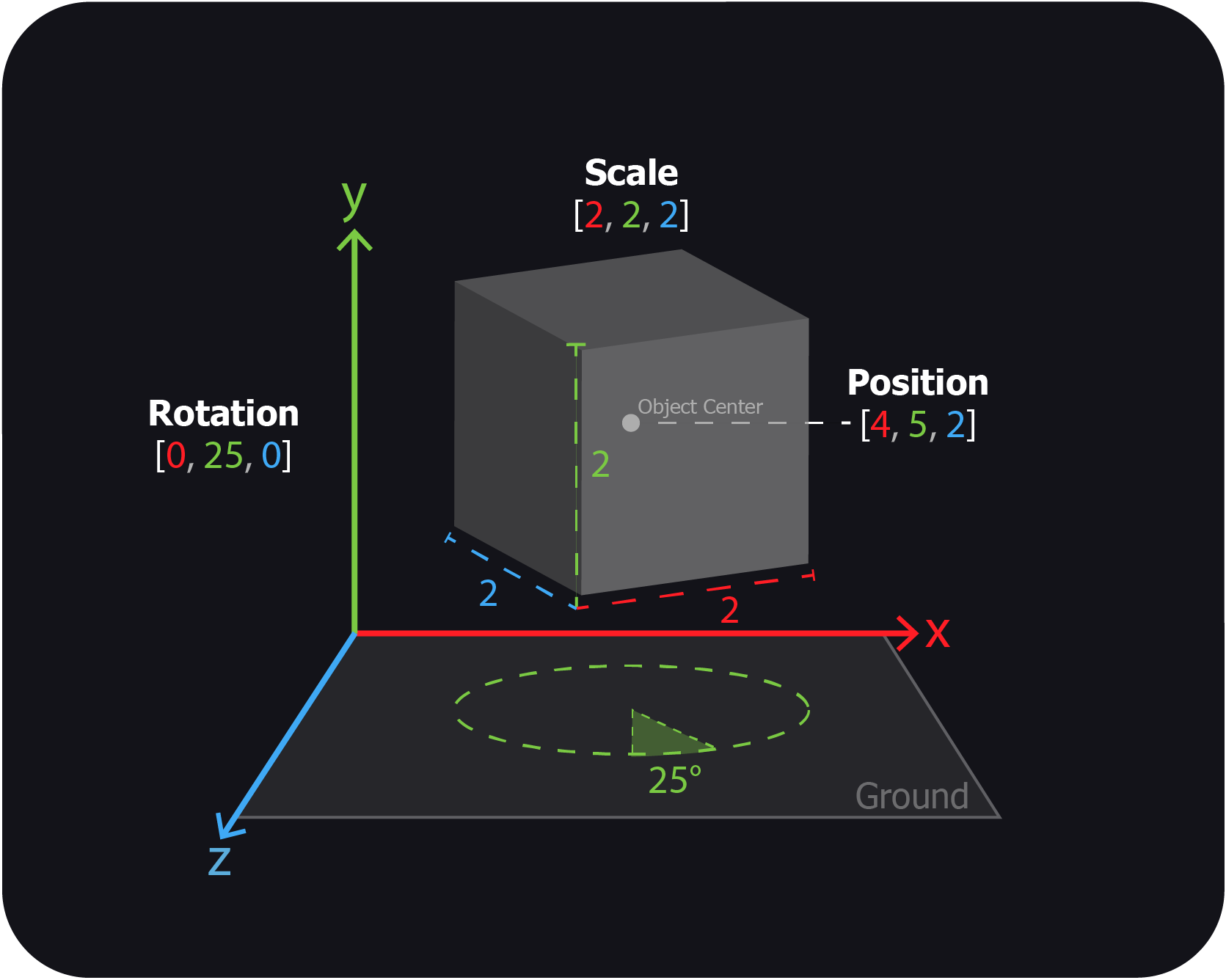 We will be referencing the Scene axis as well as the Transform Components (i.e. Position, Rotation, and Scale) of 3D Models throughout the User Manual; use the figure below as a quick reference when needed.