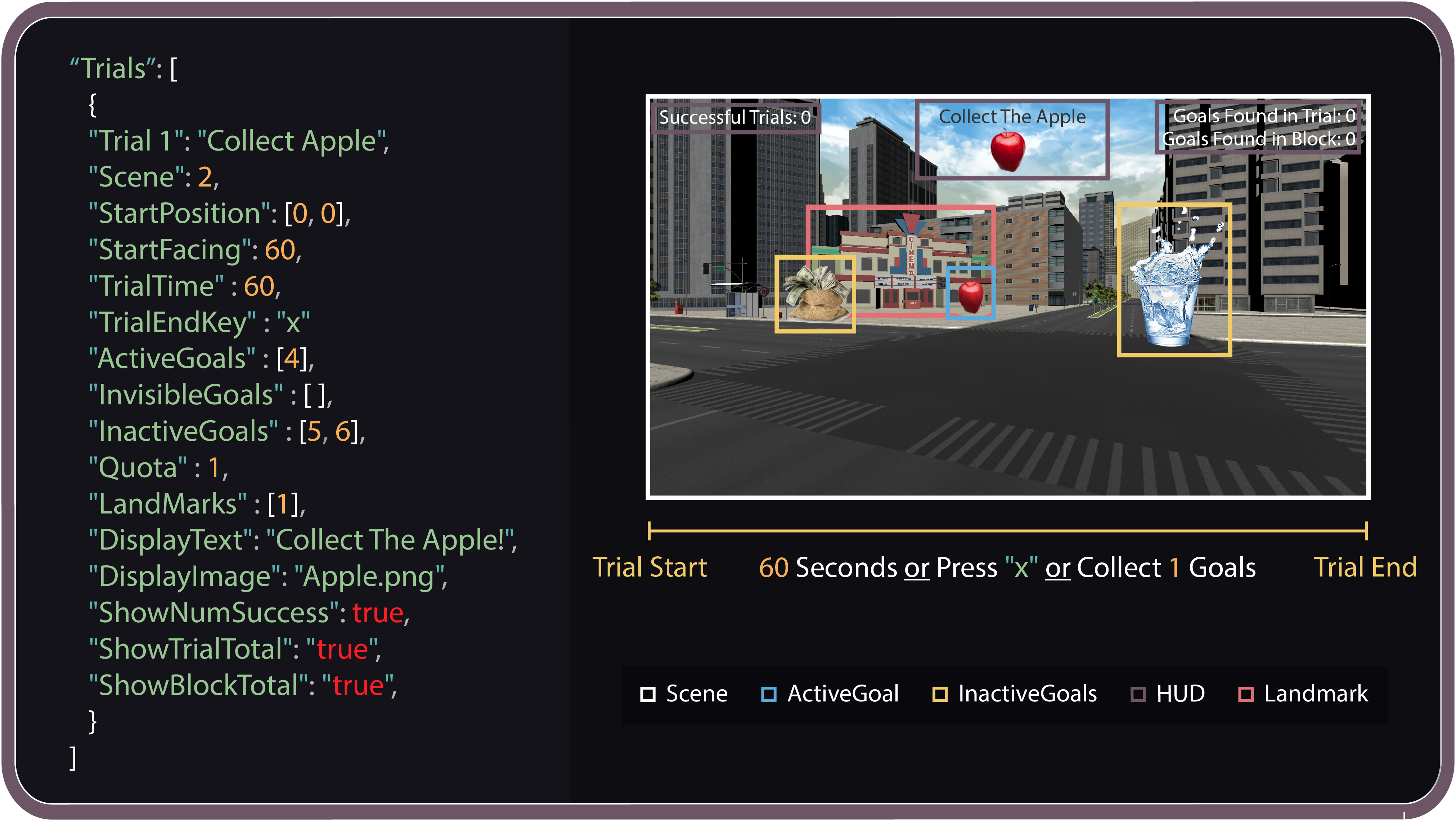 Each Task Trial allows you to create a unique navigation environment and task demand by outfitting one of your Scenes with any number of Goals and/or Landmarks, and, perhaps, an Enclosure.